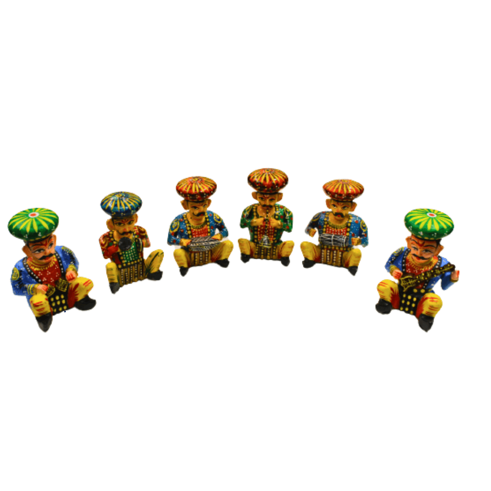 2. Mini Colorful Musicians: The six miniature musicians, each wearing traditional Indian attire of turban and dhoti, add a burst of color and culture to your space. These musicians are seated with their instruments, creating an enchanting ensemble that celebrates the vibrancy of Indian art and music.